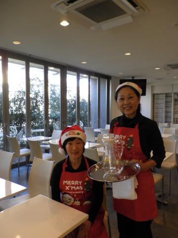 フロントスタッフはもちろん、朝食スタッフもクリスマスエプロンにサンタ帽で腕をふるっております。
