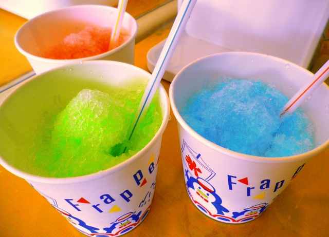 シロップはイチゴ・メロン・ハワイアンブルーの3種類ご用意しておりますのでお好みのシロップをかけて