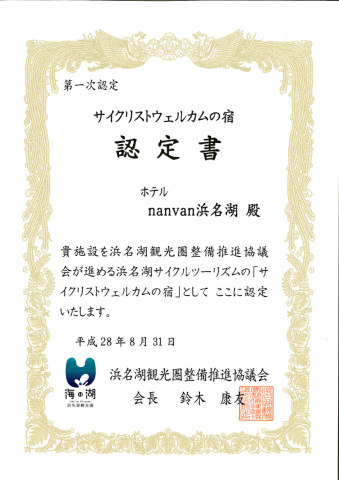 「サイクリストウェルカムの宿」認定書を受けました\(^o^)/