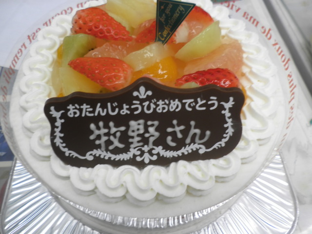 会社よりバースデーケーキをいただきウキウキ気分の牧野
