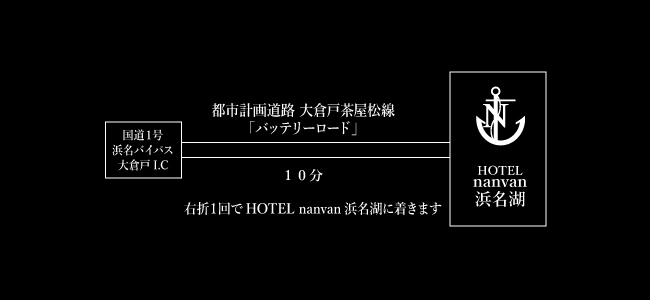 2025年3月、名古屋と豊橋を結ぶ国道23号(通称「名豊道路」)が全線開通し、名古屋方面からお越しのお客様には大変便利になりました。 国道23号はそのまま国道1号バイパスに接続し、「大倉戸IC」から「バッテリーロード」経由で10分、右折1回でホテルnanvan浜名湖に着きます。